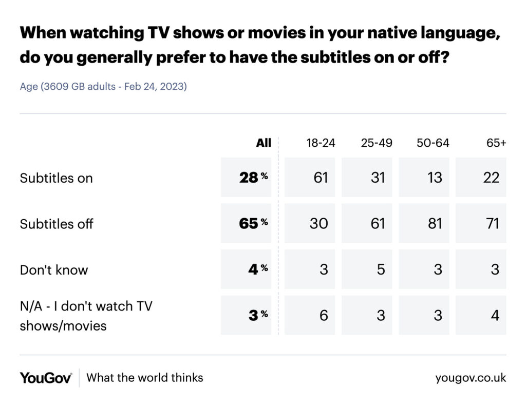 This is not some moral outrage story, cooked up by the tabloid press as part of the ongoing culture wars, it is a very real phenomenon. Moreover, it is not confined to teenage children, but younger adults too. A recent YouGov poll confirmed something we’ve been seeing signs of for several years. This poll shows that 61% of 18-24 year olds prefer to watch TV with the subtitles turned on and while it doesn’t give data for people under 18 the level of subtitle use in the younger age group is probably higher. Other, surveys also indicate a clear trend of increasing preference for subtitles with decreasing age. These trends are not new, iPlayer data from 2016 showed subtitle usage of around 30% on children’s services rising to 35% on content classified as learning. Seven years later it is no surprise to see these trends continuing to grow. Meantime in the field of computer games the usage of subtitles is even more widespread with usage figures for subtitles in major computer games of 95% and higher.
