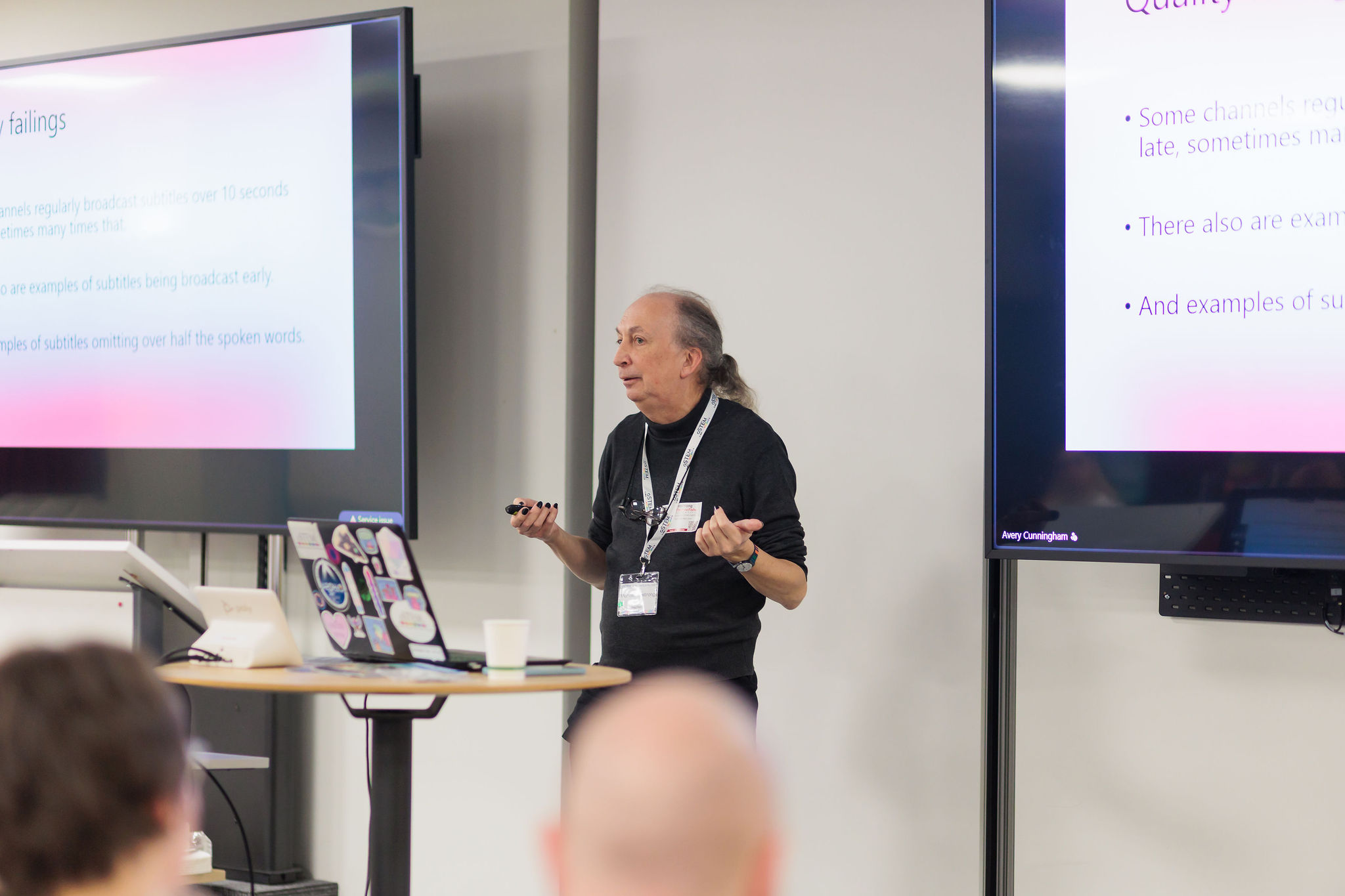 On 14th October I gave a brief talk about measuring subtitle quality as a lightning talk at Dorkbot Bristol. It was a severely cutdown version of my IBC presentation for an audience of technically and artistically minded people. When asked the question, who here uses subtitles, not quite half of the audience raised their hands and almost all of them use same language subtitles, so I had a receptive audience.