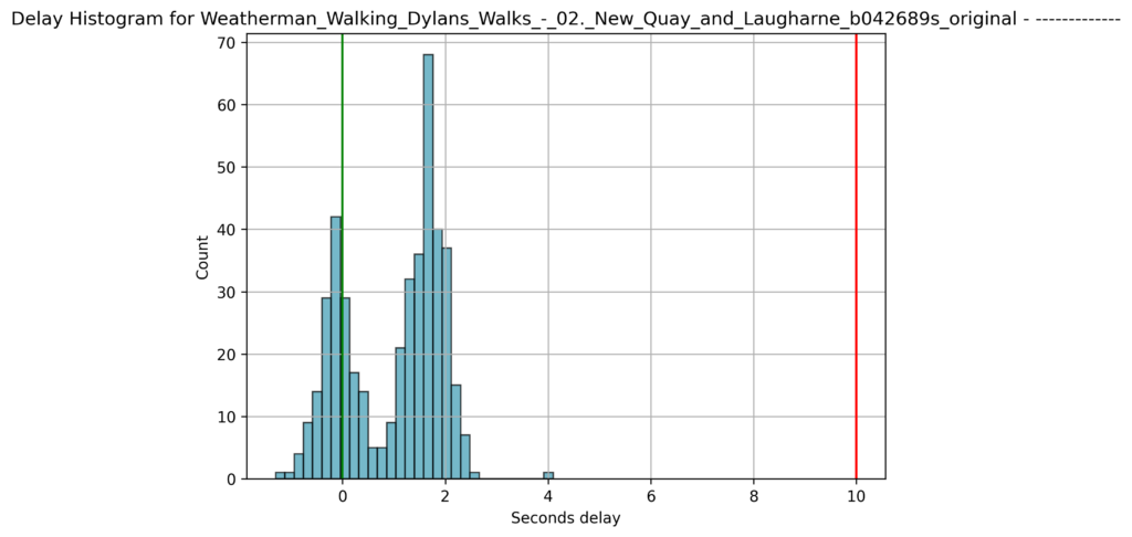 By looking at the scatter plot of delay for 09:00 to 10:00, above, it would appear this peak was caused by a technical fault, because the delay rises almost linearly before dropping back. This must be some form of buffering or rate limiting downstream of the subtitler.