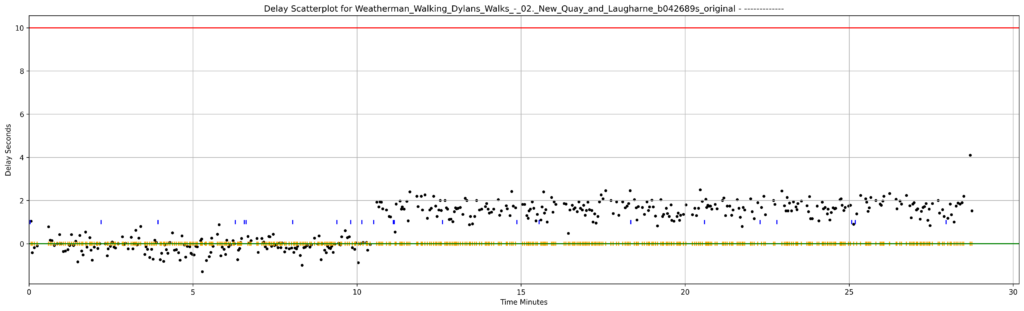 Checking back on iPlayer to measure the timing, the scatter plot shows a distinct jump in subtitle delay at around ten and a half minutes into the programme.